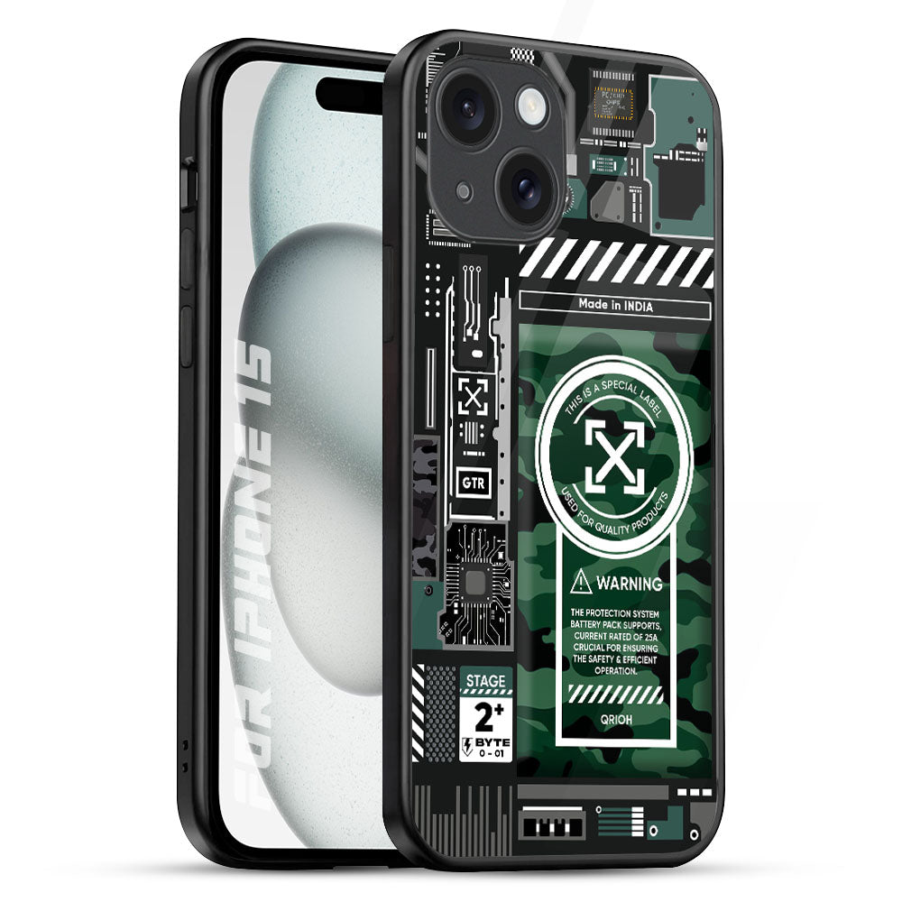 Green Camo Circuit Glass Case for iPhone 15