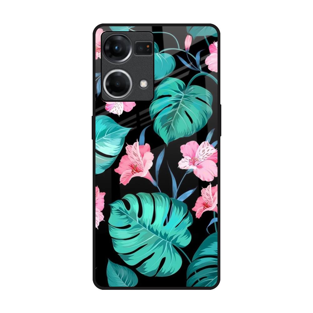 Tropical Leaves & Pink Flowers Glass Case for OPPO F21 Pro