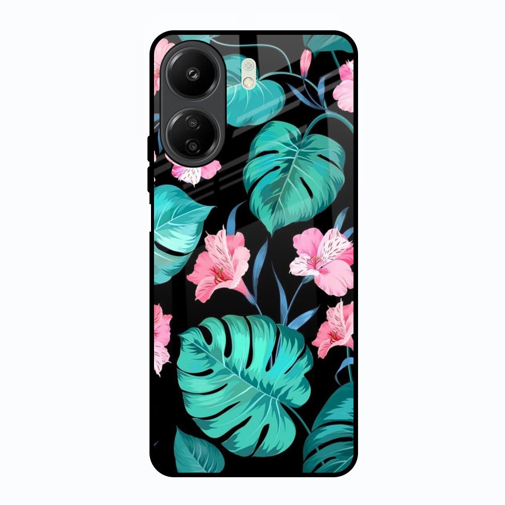 Tropical Leaves & Pink Flowers Glass Case for Redmi 13C