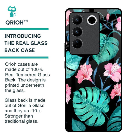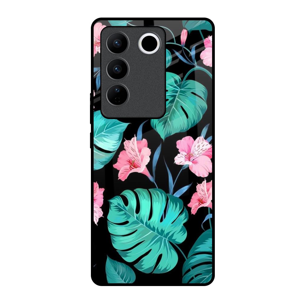 Tropical Leaves & Pink Flowers Glass Case for Vivo V27 Pro 5G