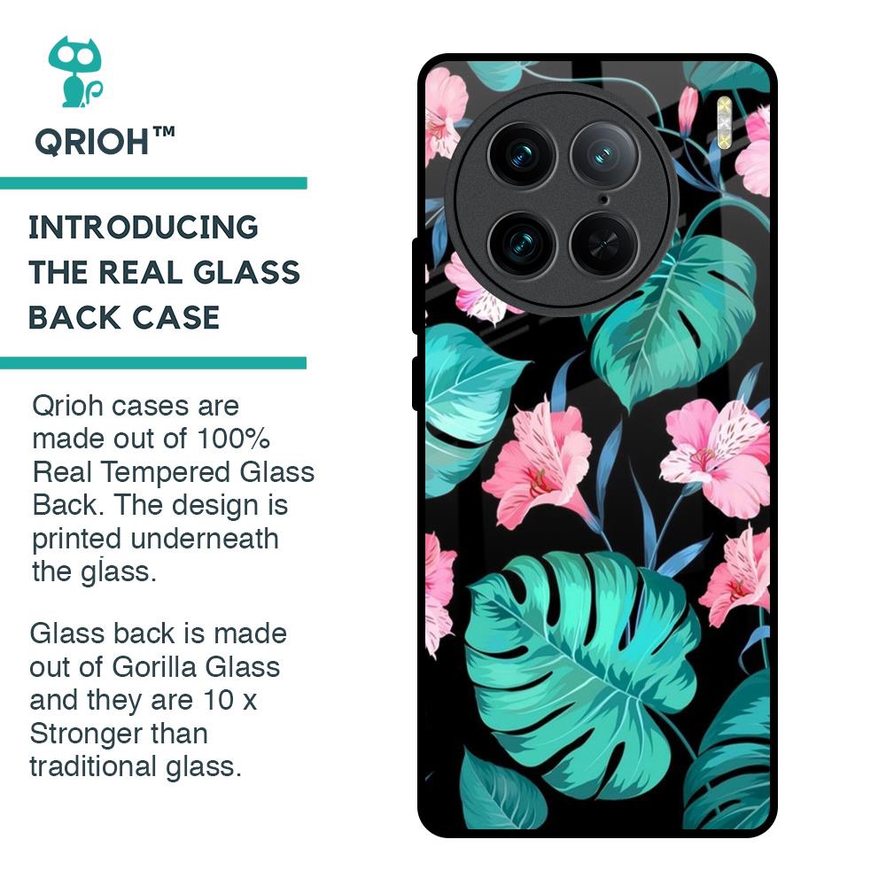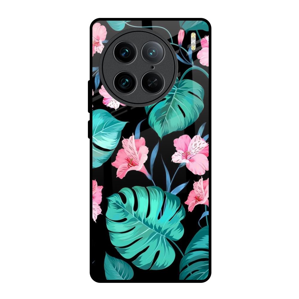 Tropical Leaves & Pink Flowers Glass Case for Vivo X90 Pro 5G
