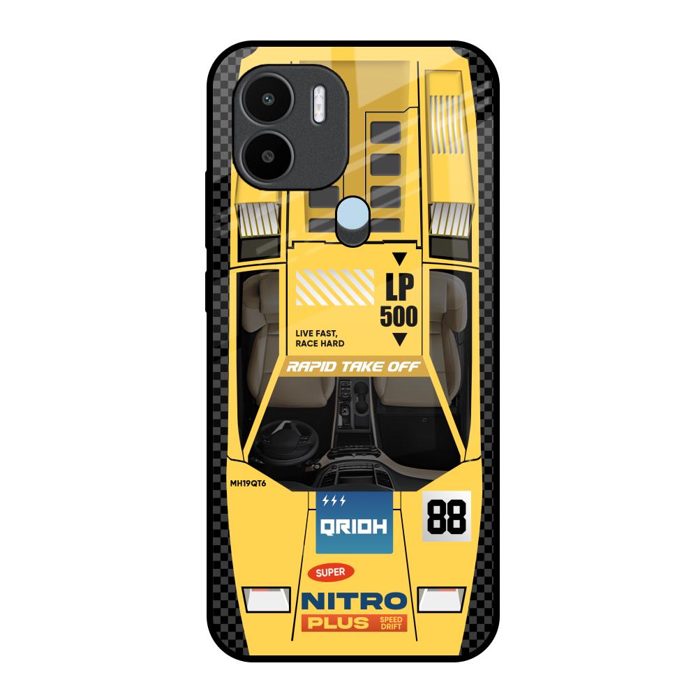 Yellow Racing Car Glass Case for Redmi A1 Plus